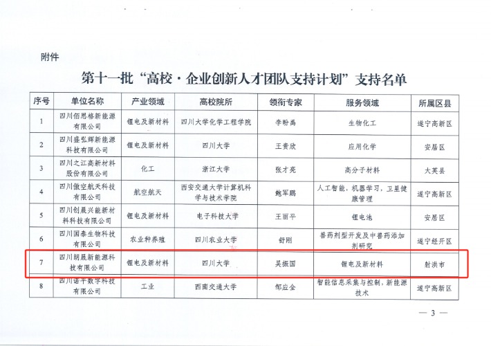 2025年9月17日,遂宁市科学技术局等3个部门联合发布了《关于纳入第十一批“高校·企业创新人才团队支持计划”支持对象的通知》,四川朗晟新能源科技有限公司与四川大学化学工程学院吴振国专家团队正式入选遂宁市第十一批“高校·企业创新人才支持团队支持计划”。此次合作将通过技术赋能、资源互通、人才培育等七大维度深度协同,为我司创新能力提升注入新动能。